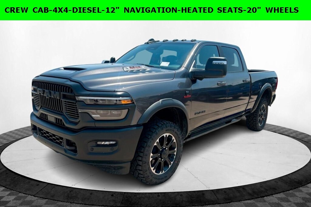 Price includes rebates. Not all customers may qualify for all rebates. $1000 - 2026 National Bonus Cash . Exp. 11/03/2025 Savings applied to everyone. Includes $1000 finance assistance. Not available with special financing, lease and select other offers. Must take new retail delivery by 10/31/2025. Savings applied to everyone. $1000.00 Retail Trade Incentive for current owners trading in 2011 or newer motor vehicle with less than 150,000 miles. Trade must run and drive with valid registration. Not available with special financing, lease and some other offers. Must take new retail delivery by 10/31/2025. Ask Dealer representative for details on qualification. *The Jimmy Britt Premium Delivery Program lets you buy this vehicle right from the comfort of your couch. We frequently deliver vehicles nationwide, and even arrange test drives at home, if you are nearby. We will send you a personal video on any vehicle you are interested in. Call, email, or text us for details.* (Plus, you get our low-price guarantee and two free oil changes!) Factory MSRP: $85,920 Bluetooth / Hands-free, Apple Car Play / Android Auto Compatible, Back-Up Camera w/ Guidelines, Cruise Control, Heated Seats, Navigation, Portable Audio Connection, Power Locks, Power Windows, Premium Wheels, Security System, Multi-function Steering Wheel, 4x4/4WD, Apple Carplay, Android Auto, *Premium Delivery Service Available*, iphone / Droid Navigation Compatible, 2500 Rebel, 4D Crew Cab, 6.7L I6, 4WD, Granite Crystal Metallic Clearcoat, Black w/Cloth Heated Power Bench Seat or Leather Trimmed Bucket Seats or Leather Trimmed Bucket Seats (GL) or Leather Trimmed Bucket Seats (NL) or Leather Trimmed Bucket Seats (PL), 4G LTE Wi-Fi Hot Spot, 5th Wheel/Gooseneck Towing Prep Group, Adjustable pedals, Alexa Built-In, AM/FM radio: SiriusXM with 360L, Apple CarPlay, Apple CarPlay/Android Auto, Automatic temperature control, Cloth Heated Power Bench Seat, Folding Flat Load Floor Storage, For Details, Visit DriveUconnect.com, For More Info, Call 800-643-2112, Front dual zone A/C, Google Android Auto, GPS Antenna Input, GPS Navigation, Heated Front Seats, Heated front seats, Heated Steering Wheel, Integrated Voice Command w/Bluetooth, Low tire pressure warning, Navigation System, ParkView Rear Back-Up Camera, Power driver seat, Quick Order Package 24R Rebel, Radio: Uconnect 5 Nav w/12.0" Display, Rear anti-roll bar, Rear window defroster, Remote keyless entry, Trailer Tow Pages, Turn signal indicator mirrors, Vendor Painted Cargo Box, Vendor Painted Cargo Box Tracking, Wheels: 20" x 8.0" Black Diamond Cut Aluminum. Granite Crystal Metallic Clearcoat 2026 Ram 2500 Rebel 6.7L I6 4WD