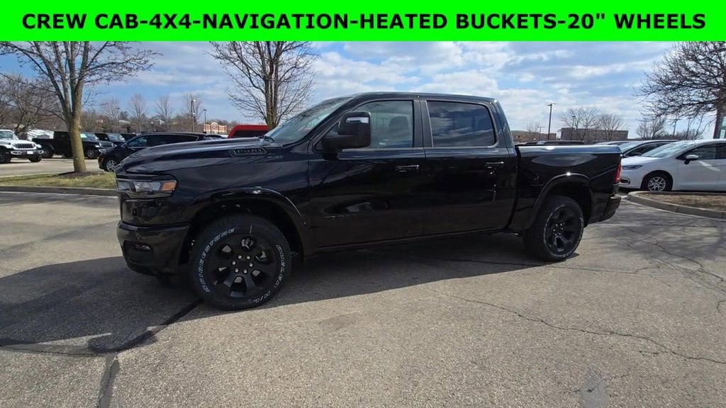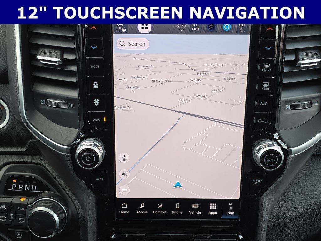 Bluetooth / Hands-free, Apple Car Play / Android Auto Compatible, Back-Up Camera w/ Guidelines, Cruise Control, Heated Seats, Multi-Zone Climate Control, Navigation, Portable Audio Connection, Power Locks, Power Windows, Premium Audio, Premium Wheels, Security System, Multi-function Steering Wheel, 4x4/4WD, Level 2 Equipment Group, Apple Carplay, Android Auto, *Premium Delivery Service Available*, iphone / Droid Navigation Compatible, 1500 Big Horn/Lone Star, 4D Crew Cab, 3.0L I6, 4WD, Diamond Black Crystal Pearlcoat, Black w/Cloth Bucket Seats or Cloth Bench Seat or Deluxe Cloth Bucket Seats, 115V Auxiliary Power Outlet, 115V Auxiliary Rear Power Outlet, 12 Touchscreen Display, 3 Rear Seat Head Restraints, 4 Way Front Headrests, 400W Inverter, 4G LTE Wi-Fi Hot Spot, Accent Color Door Handles, Accent Color Tailgate Handle, Anti-Spin Differential Rear Axle, Apple CarPlay, Apple CarPlay/Android Auto, Auto Power-Folding Mirrors, Auto-Dimming Exterior Driver Mirror, Auto-Dimming Rear-View Mirror, Big Horn Level 2 Equipment Group, Black Exterior Mirrors, Black Exterior Truck Badging, Black Headlamp Bezels, Black Interior Accents, Black Painted Exterior Mirrors Caps, Black Premium Power Mirrors, Black Tail Lamp Bezels, Body Color Fender Flares, Body Color Front Bumper, Bucket Seats, Center Console Parts Module, Cloth Bucket Seats, Cluster 7.0 TFT Color Display, Configurable Drive Mode, Connectivity - US/Canada, Convex Wide-Angle Exterior Mirror Insert, Deluxe Cloth Bucket Seats, Disassociated Touchscreen Display, Exterior Mirrors Courtesy Lamps, Front Seat Back Map Pockets, Full Length Floor Console, Glove Box Lamp, Google Android Auto, GPS Antenna Input, GPS Navigation, Grille Black Surround Black Mesh, HD Radio, Heated Front Seats, Heated Steering Wheel, Integrated Center Stack Radio, Leather Wrapped Steering Wheel, LED Footwell Lighting, Lone Star Badge, Low tire pressure warning, Navigation System, Night Edition, Overhead LED Lamps, ParkView Rear Back-Up Camera, Power 2-Way Driver Lumbar Adjust, Power Adjust 8-Way Driver Seat, Power Adjustable Pedals, Premium Overhead Console, Radio: Uconnect 5 Navigation with 12.0 Display, RAM Grille Badge - Black, Rear 60/40 Folding Seat, Rear anti-roll bar, Rear Center Armrest, Rear Power Sliding Window, Rear Window Defroster, Remote keyless entry, Remote Tailgate Release, Security Alarm, SiriusXM Radio Service, Steering Wheel Mounted Audio Controls, USB Host Flip, Wheels: 20 x 9.0 Aluminum Painted Clad.