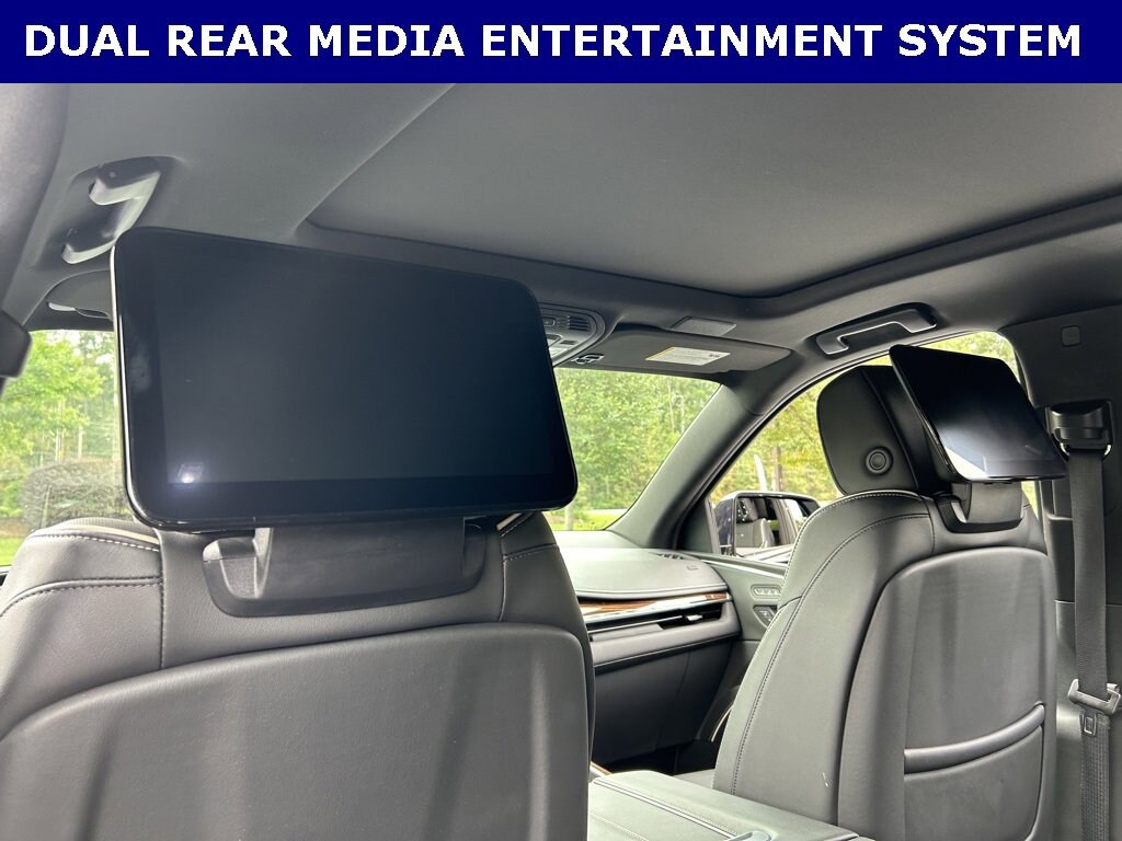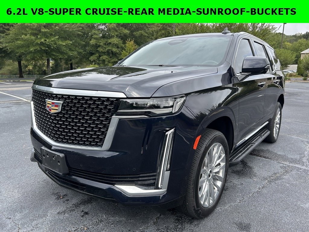 iPhone/ Android Navigation compatible, Automatic Headlights, Rearview Camera, Bluetooth, Leather, 1 Owner, Sunroof / Moonroof, Rear DVD Entertainment System, Towing Package / Hitch, Running Boards, Heated and Vented Front Seats, Heated 2nd Row, Heated Steering Wheel, Remote Starter System, Mutli-function Steering Wheel, Includes the Remainder of the Factory Warranty, Extended Warranty Available, Apple Carplay, ONSTAR, 3rd Row Seats, Push Button Start, Remote Keyless Entry, Andoid Auto, Premium Delivery Service Available, Escalade Premium Luxury, 4D Sport Utility, 6.2L V8, 10-Speed Automatic, Dark Moon Blue Metallic, Jet Black w/Leather Seating w/Precision Perforated Inserts, 16.9 Diagonal OLED Infotainment Screen, 3.23 Axle Ratio, Adaptive Cruise Control, AKG Studio 19-Speaker Audio System, Apple CarPlay/Android Auto, Automatic Seat Belt Tightening, Automatic temperature control, Door Lock & Latch Shields, Emergency communication system: OnStar and Cadillac connected services capable, Enhanced Automatic Emergency Braking, Enhanced Automatic Parking Assist, Exterior Parking Camera Rear, Front dual zone A/C, Glass Breakage Sensor, HD Radio, Heads-Up Display, Heated & Ventilated Driver & Front Passenger Seats, Heated Driver & Front Passenger Seats, Heated front seats, Heated rear seats, Heated steering wheel, Lane Change Alert w/Side Blind Zone Alert, Leather Seating Surfaces w/Mini-Chevron Perf Inserts, Low tire pressure warning, Mechanical Limited-Slip Differential, Navigation System, Power driver seat, Power Liftgate, Power moonroof, Power Panoramic Tilt-Sliding Sunroof, Power passenger seat, Preferred Equipment Group 1SB, Radio: AM/FM w/Navigation, Rain sensing wipers, Rear air conditioning, Rear anti-roll bar, Rear Camera Mirror, Rear Camera Mirror Washer, Rear Cross Traffic Alert, Rear Seat Entertainment System, Reconfigurable Full-Color Head-Up Display, Remote keyless entry, Reverse Automatic Braking, Running Board Assist Steps, SiriusXM w/360L, Super Cruise, Teen Driver, Theft-Deterrent Alarm System, Vehicle Inclination Sensor, Vehicle Interior Movement Sensor, Ventilated front seats, Wheel Locks, Wheels: 22 14-Spoke Alloy w/Polished Finish, Wireless Apple CarPlay/Wireless Android Auto.