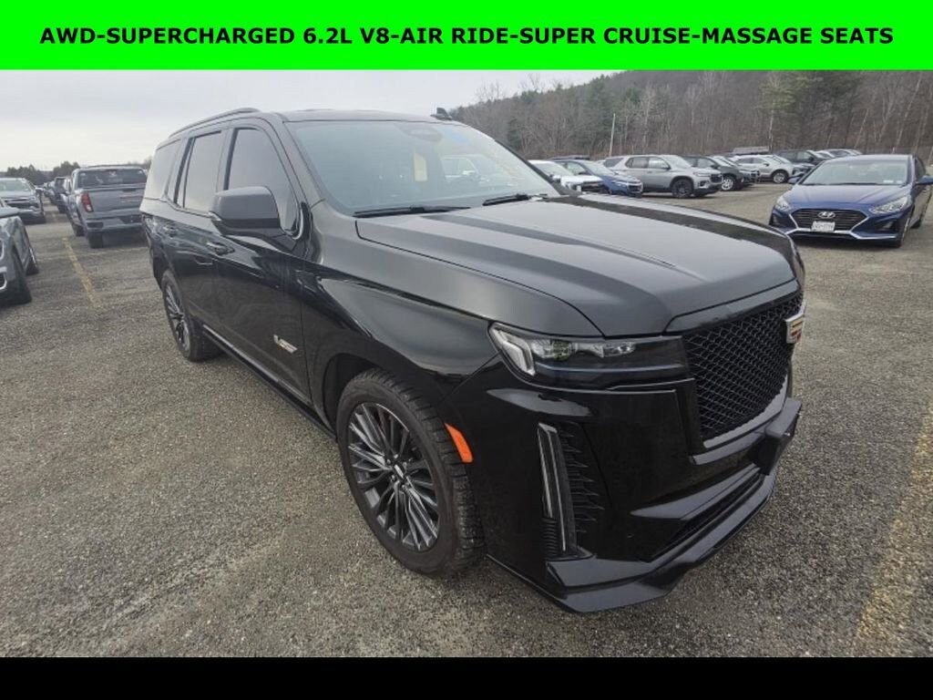 NEW ARRIVAL PHOTOS COMING SOON!, iPhone/ Android Navigation compatible, Automatic Headlights, Rearview Camera, Bluetooth, Leather, Sunroof / Moonroof, Rear DVD Entertainment System, Towing Package / Hitch, Running Boards, Heated and Vented Front Seats, Heated 2nd Row, Heated Steering Wheel, Remote Starter System, Mutli-function Steering Wheel, 4X4, Includes the Remainder of the Factory Warranty, Extended Warranty Available, Apple Carplay, ONSTAR, 3rd Row Seats, Push Button Start, Remote Keyless Entry, Andoid Auto, Premium Delivery Service Available, Escalade V-Series, 4D Sport Utility, 6.2L V8 Supercharged, 10-Speed Automatic with Overdrive, AWD, Black Raven, Jet Black w/Full Semi-Aniline Leather Seats w/Mondrian Quilt, Active Noise Cancellation, Adaptive Cruise Control, AKG Studio Reference 36-Speaker Audio System, Automatic Seat Belt Tightening, Body-Color Door Handles, Door Lock & Latch Shields, Electronic Limited-Slip Differential, Enhanced Automatic Emergency Braking, Enhanced Automatic Parking Assist, Floor Console w/Covered Storage, Glass Breakage Sensor, Heated & Ventilated Driver & Front Passenger Seats, Hitch Guidance w/Hitch View, Integrated Trailer Brake Controller, Navigation System, Platinum Interior Trim, Power Lumbar Massage Driver Seat, Power Lumbar Massage Front Passenger Seat, Power Panoramic Tilt-Sliding Sunroof, Power-Retractable Assist Steps, Preferred Equipment Group 1SD, Rear Camera Mirror, Rear Camera Mirror Washer, Rear Cross Traffic Alert, Rear Seat Entertainment System, Reconfigurable Full-Color Head-Up Display, Reverse Automatic Braking, Smart Trailer Integration Indicator, Super Cruise, Theft-Deterrent Alarm System, Touring Package, Trailer Side Blind Zone Alert, Vehicle Inclination Sensor, Vehicle Interior Movement Sensor, Wheels: 22 18-Spoke Alloy.