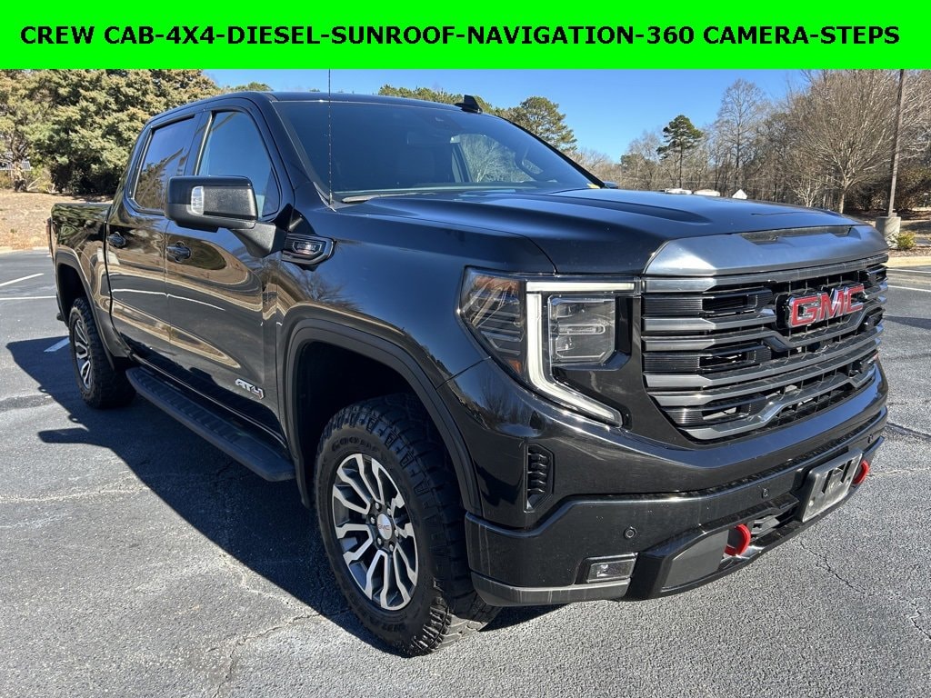 iPhone/ Android Navigation compatible, Automatic Headlights, Rearview Camera, Bluetooth, Leather, 1 Owner, Sunroof / Moonroof, Towing Package / Hitch, Bedliner, Running Boards, Heated and Vented Front Seats, Heated 2nd Row, Heated Steering Wheel, Remote Starter System, LED Cargo Box Lighting, Bose Premium Speaker System, Mutli-function Steering Wheel, 4X4, Extended Warranty Available, Apple Carplay, ONSTAR, Push Button Start, Remote Keyless Entry, Andoid Auto, Premium Delivery Service Available, Sierra 1500 AT4, 4D Crew Cab, 3.0L I6, 4WD, Onyx Black, Jet Black w/Kalahari Accents w/Perforated Front Leather Seat Trim, 120-Volt Instrument Panel Power Outlet, 18 x 8.5 Machined Aluminum Wheels, 2 Charge/Data USB Ports Inside Center Console, 2 Type-C Charge-Only Rear USB Ports, 2 USB Ports, 220 Amp Alternator, 3.23 Rear Axle Ratio, Adaptive Cruise Control, Apple CarPlay/Android Auto, AT4 Preferred Package, AT4 Premium Package, Auto-Locking Rear Differential, Automatic temperature control, Black Chrome Header & Grille Insert Bars, Cargo Convenience Package, Compass, Console-Mounted Safe (LPO), Deep-Tinted Glass, Electric Rear-Window Defogger, Emergency communication system: OnStar and GMC connected services capable, Floor-Mounted Center Console, Following Distance Indicator, Forward Collision Alert, Front dual zone A/C, Front Pedestrian Braking, Front Rainsensing Wipers, GMC Connected Access Capable, HD Surround Vision, Heated 2nd Row Outboard Seats, Heated Driver & Front Outboard Passenger Seating, Heated front seats, Heated rear seats, Heated steering wheel, Heavy-Duty Air Filter, Hill Descent Control, Hitch Guidance w/Hitch View, In-Vehicle Trailering App, Integrated Trailer Brake Controller, Keyless Open & Start, Lane Keep Assist w/Lane Departure Warning, LED Cargo Area Lighting, Low tire pressure warning, Navigation System, Off-Road High Clearance Step (LPO), OnStar & GMC Connected Services Capable, Perforated Front Leather Seat Trim, Perimeter Lighting, Power driver seat, Power Front Passenger Windows w/Express Up/Down, Power Front Windows w/Driver Express Up/Down, Power passenger seat, Power Rake & Telescoping Steering Column, Power Rear Windows w/Express Down, Power Sliding Rear Window w/Rear Defogger, Power Sunroof, Preferred Equipment Group 4SB, Premium Bose 7-Speaker Sound System, Push Button Start, Rain sensing wipers, Rear Cross Traffic Braking, Rear Pedestrian Detection, Rear Underseat Storage (LPO), Rear Wheelhouse Liners, Red Recovery Hooks, Remote Vehicle Starter System, SiriusXM w/360L, Spray-On Pickup Bed Liner w/AT4 Logo, Steering Wheel Audio Controls, Theft Deterrent System (Unauthorized Entry), Trailer Camera Provisions, Trailer Side Blind Zone Alert, Trailering Package, Ultrasonic Front & Rear Park Assist, Universal Home Remote, Ventilated Driver & Front Passenger Seats, Ventilated front seats, Wi-Fi Hotspot Capable, Wireless Charging, Wireless Phone Projection.