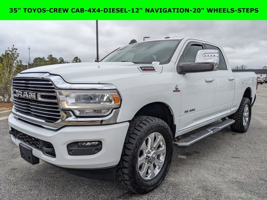 One Owner, Clean Autocheck / No Accidents, Extended Warranty Available, Bluetooth / Hands-free, Apple Car Play / Android Auto Compatible, Back-Up Camera w/ Guidelines, Cruise Control, Heated Seats, Leather Seats, Multi-Zone Climate Control, Navigation, Portable Audio Connection, Premium Audio, Premium Wheels, Multi-function Steering Wheel, Trailer Hitch, 4x4/4WD, Remote Start, Spray-in Bedliner, Level I Equipment Group, Apple Carplay, Android Auto, Cooled Seats, Oversized Tires, *Premium Delivery Service Available*, iphone / Droid Navigation Compatible, 35 TOYO R/T TIRES, 2500 Laramie, 4D Crew Cab, Cummins 6.7L I6 Turbodiesel, 4WD, Bright White Clearcoat, Black w/Leather Trim 40/20/40 Bench Seat or Leather Trimmed Bucket Seats, 115V Auxiliary Rear Power Outlet, 12 Touchscreen Display, 2 Way Rear Headrest Seat, 20 x 8.0 Polished Aluminum Wheels, 220 Amp Alternator, 2nd Row In Floor Storage Bins, 3.73 Axle Ratio, 4 Way Front Headrests, 4G LTE Wi-Fi Hot Spot, Alexa Built-In, Apple CarPlay, Apple CarPlay/Android Auto, Auto Adjust In Reverse Exterior Mirrors, Auto Dim Exterior Mirror, Auto High Beam Headlamp Control, Auto Power-Folding Mirrors, Auto-Dimming Exterior Passenger Mirror, Automatic temperature control, Bed Utility Group, Blind Spot & Cross Path Detection, Bucket Seats, Chrome Exterior Mirrors, Chrome Flat Cab-Length Side Steps, Cold Weather Group, Connected Travel & Traffic Services, Connectivity - US/Canada, Dash Pass Thru Wire Circuits, Diesel Exhaust Brake, Disassociated Touchscreen Display, Engine Block Heater, Exterior Mirrors Courtesy Lamps, Exterior Mirrors w/Heating Element, Exterior Mirrors w/Memory, Exterior Mirrors w/Supplemental Signals, Foam Bottle Insert (Door Trim Panel), Folding Flat Load Floor Storage, For Details, Visit DriveUconnect.com, For More Info, Call 800-643-2112, Forward & Reverse Utility Lights, Front dual zone A/C, Front LED Fog Lamps, Front Performance Tuned Shock Absorbers, Front Seat Back Map Pockets, Full Length Upgraded Floor Console, Global Telematics Box Module (TBM), Google Android Auto, GPS Antenna Input, GPS Navigation, HD Radio, Heated Front Seats, Heated Steering Wheel, Heavy Duty Snow Plow Prep Group, High Back Seats, Hill Descent Control, I/P Mounted Auxiliary Switches, Integrated Voice Command w/Bluetooth, Laramie Level 1 Equipment Group, Leather Trimmed Bucket Seats, LED Bed Lighting, LED Reflector Headlamps, Low tire pressure warning, Mirror Running Lights, MOPAR Deployable Bed Step, MOPAR Spray In Bedliner, MOPAR Winter Front Grille Cover, Navigation System, Off Road Package, Off-Road Information Pages, ParkSense Front/Rear Park Assist System, ParkView Rear Back-Up Camera, Power 2-Way Driver Lumbar Adjust, Power 2-Way Passenger Lumbar Adjust, Power Adjust 8-Way Driver Seat, Power Adjust 8-Way Front Passenger Seat, Power Adjust Mirrors, Power Adjustable Convex Aux Mirrors, Power Adjustable Pedals w/Memory, Power driver seat, Power Heated Fold Telescopic Mirrors w/Memory, Power passenger seat, Power Telescoping Mirrors, Quick Order Package 2HH Laramie, Radio: Uconnect 5 Nav w/12.0 Display, Radio/Driver Seat/Mirrors/Pedals Memory, Rain Sensitive Windshield Wipers, Rear 60/40 Folding Seat, Rear anti-roll bar, Rear Performance Tuned Shock Absorbers, Rear Power Sliding Window, Rear Window Defroster, Remote keyless entry, Remote Tailgate Release, Selectable Tire Fill Alert, SiriusXM Radio Service, SiriusXM w/360L, Tow Hooks, Trailer Tow Pages, Ventilated Front Seats.