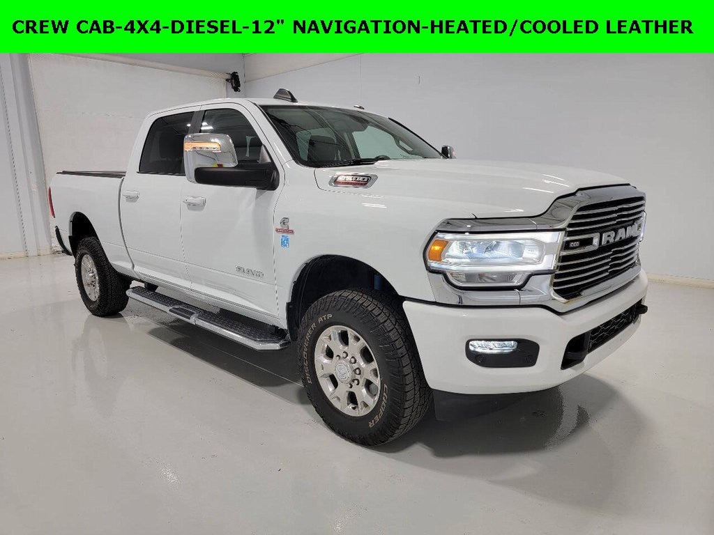 One Owner, Clean Autocheck / No Accidents, Remaining Factory Warranty, Extended Warranty Available, Bluetooth / Hands-free, Apple Car Play / Android Auto Compatible, Back-Up Camera w/ Guidelines, Heated Seats, Keyless Entry, Leather Seats, Multi-Zone Climate Control, Navigation, Portable Audio Connection, Premium Audio, Premium Wheels, Multi-function Steering Wheel, Trailer Hitch, 4x4/4WD, Remote Start, Spray-in Bedliner, Apple Carplay, Android Auto, Cooled Seats, *Premium Delivery Service Available*, iphone / Droid Navigation Compatible, 2500 Laramie, 4D Crew Cab, Cummins 6.7L I6 Turbodiesel, 4WD, Bright White Clearcoat, Black w/Leather Trim 40/20/40 Bench Seat or Leather Trimmed Bucket Seats, 12 Touchscreen Display, 2nd Row In Floor Storage Bins, 4G LTE Wi-Fi Hot Spot, Alexa Built-In, Apple CarPlay, Auto Adjust In Reverse Exterior Mirrors, Auto Dim Exterior Mirror, Auto High Beam Headlamp Control, Auto Power-Folding Mirrors, Auto-Dimming Exterior Passenger Mirror, Bed Utility Group, Blind Spot & Cross Path Detection, Chrome Exterior Mirrors, Cold Weather Group, Connected Travel & Traffic Services, Connectivity - US/Canada, Diesel Exhaust Brake, Disassociated Touchscreen Display, Engine Block Heater, Exterior Mirrors Courtesy Lamps, Exterior Mirrors w/Heating Element, Exterior Mirrors w/Memory, Exterior Mirrors w/Supplemental Signals, Foam Bottle Insert (Door Trim Panel), For Details, Visit DriveUconnect.com, For More Info, Call 800-643-2112, Forward & Reverse Utility Lights, Front LED Fog Lamps, Front Performance Tuned Shock Absorbers, Global Telematics Box Module (TBM), Google Android Auto, GPS Navigation, HD Radio, Heavy Duty Snow Plow Prep Group, Hill Descent Control, Integrated Voice Command w/Bluetooth, Laramie Level 1 Equipment Group, LED Bed Lighting, LED Reflector Headlamps, LED Tail Lamps, Mirror Running Lights, MOPAR Deployable Bed Step, MOPAR Spray In Bedliner, MOPAR Winter Front Grille Cover, Navigation System, Off Road Package, Off-Road Information Pages, ParkSense Front/Rear Park Assist System, Power Adjust Mirrors, Power Adjustable Convex Aux Mirrors, Power Adjustable Pedals w/Memory, Power Heated Fold Telescopic Mirrors w/Memory, Power Telescoping Mirrors, Quick Order Package 2HH Laramie, Radio: Uconnect 5 Nav w/12.0 Display, Rain Sensitive Windshield Wipers, Rear Performance Tuned Shock Absorbers, Rear Power Sliding Window, Remote Tailgate Release, Selectable Tire Fill Alert, SiriusXM Radio Service, SiriusXM w/360L, Tow Hooks, Trailer Tow Pages, Wheels: 18 x 8.0 Polished Aluminum.